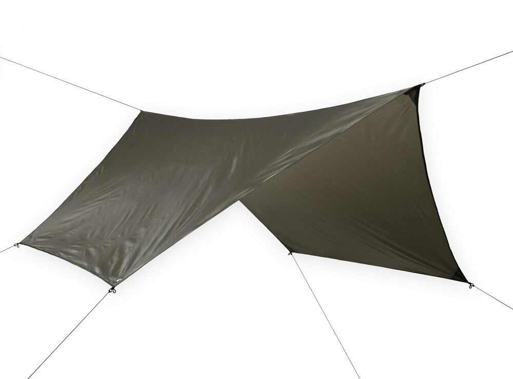 Can be angled out to provide a large covered area for cooking or relaxing or can be staked down near the ground on both sides of the hammock. The "Hex" Fly can also be used on its own. Because of the wind load, this fly should be tied directly to trees with strong polyester cords provided. Two tie outs on each side.