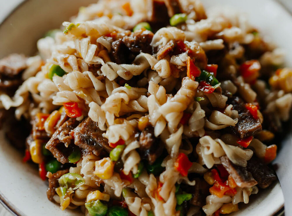 Pasta (31%) (Durum Wheat), Beef Dices (29%) (Beef, Soy Protein Concentrate, Salt, Mineral Salt (451, 450), Rosemary Extract), Sauce (Thickener (1442), Maltodextrin, Brown Sugar, Sugar, Yeast, Salt, Colour (150D), Flavour Enhancer (635), Herbs & Spices, Canola Oil, Vegetable Extract), Carrot (Carrot, Sugar, Acidity Regulator (500)), Corn, Peas (Peas, Acidity Regulator (331, 500))