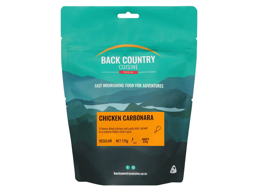 Back Country Cuisine Chicken Carbonara is a freeze dried chicken and pasta dish, served in a creamy italian style sauce. A quick and easy freeze dried meal, just add boiling water.