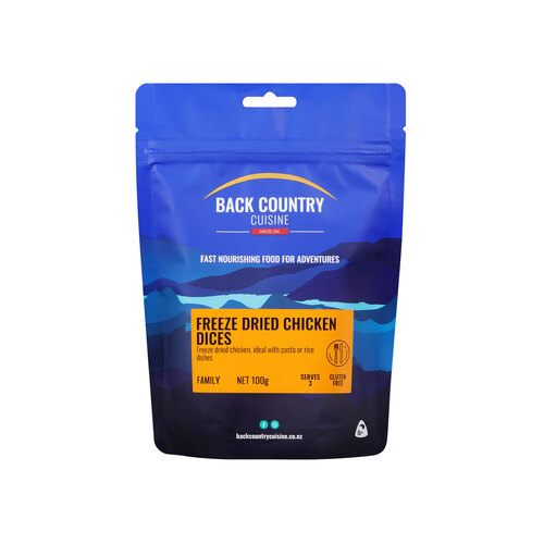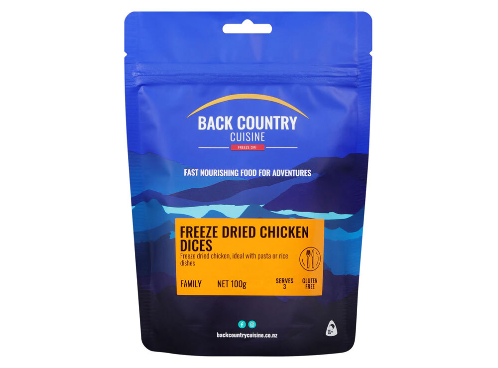 Back Country Cuisine Chicken Dices is a quick and easy freeze dried meal complement, ideal with pasta or rice dishes. Just add boiling water. Gluten free. No added dairy.