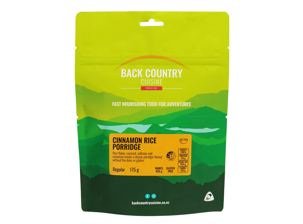 This Back Country Cuisine Regular Cinnamon Rice Porridge is light to carry and provides tasty, fast nourishing food for adventure by adding boiling water. Enjoy rice flakes, coconut, sultanas and cinnamon to create a classic porridge flavour without the dairy or gluten. Vegan.