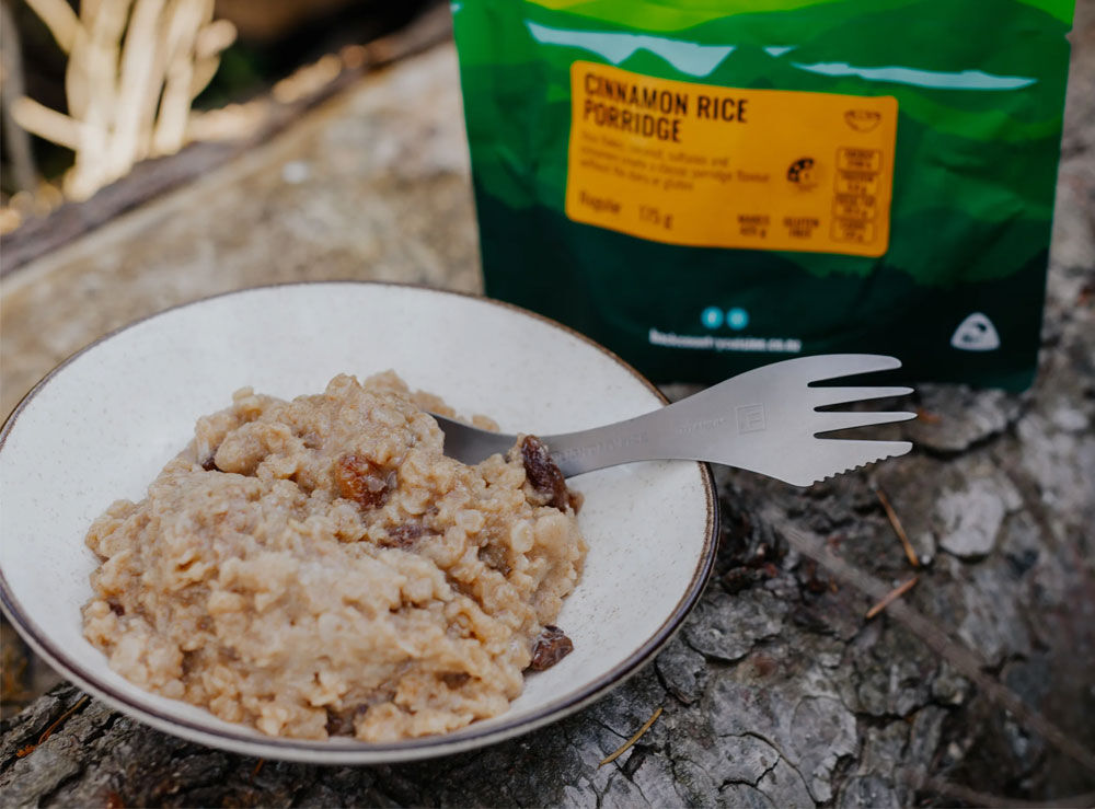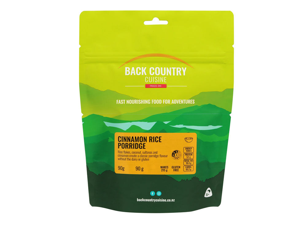 This Back Country Cuisine Small Cinnamon Rice Porridge is light to carry and provides tasty, fast nourishing food for adventure by adding boiling water. Enjoy rice flakes, coconut, sultanas and cinnamon to create a classic porridge flavour without the dairy or gluten. Vegan.