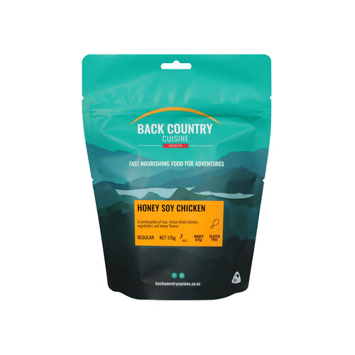 Back Country Cuisine Honey Soy Chicken is a combination of rice, freeze dried chicken, vegetables and honey flavour. Gluten Free. No added dairy. A quick and easy freeze dried meal, just add boiling water.