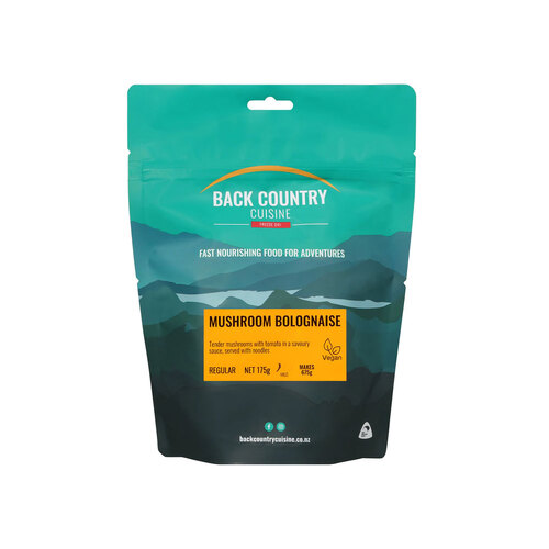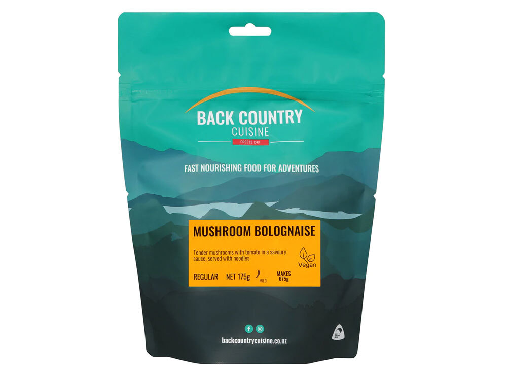 Back Country Cuisine Mushroom Bolognaise is packed with tender mushrooms with tomato in a savory sauce, served with noodles. A quick and easy freeze dried meal, just add boiling water.