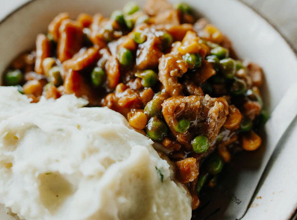 Mashed Potato (Potato Flakes (Potato, Emulsifier (471), Preservative (330), Antioxidant (223)), Milk Powder (Contains Emulsifier (322)), Canola Oil (Contains Antioxidant (319), Antifoaming Agent (900A)), Salt, Sugar, Chives), Sauce (Maltodextrin, Thickener (1442), Starch, Rice Flour, Salt, Yeast Extract, Hydrolysed Vegetable Protein, Sugar, Colour (150D), Yeast, Vegetables, Acidity Regulator (330)), Chicken Dices (21%) (Chicken, Soy Protein Concentrate, Salt, Mineral Salt (451, 450), Rosemary Extract), Stuffing (Bread (Flour, Gluten, Yeast, Vegetable Oil, Vinegar, Soy, Emulsifers (472E, 481, 471), Improvers (170, 300)), Egg, Milk Powder (Contains Emulsifier (322)), Herbs, Onion, Salt), Peas (Peas, Acidity Regulator (331, 500)), Corn