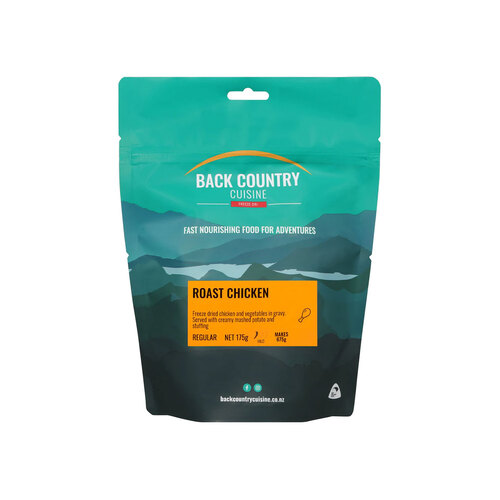 Back Country Cuisine Roast Chicken contains freeze dried chicken and vegetables in gravy. Served with creamy mashed potato and stuffing. A quick and easy dehydrated meal, just add boiling water.