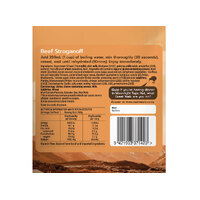 Small: Serves per pack 1. Net weight 90g. Preparation: Remove potato pouch. Add 125 ml (½ cup or MT KOSCIUSZKO fill line) of boiling water to meal pouch and add 125 ml (½ cup) of boiling water to potato pouch. Stir and stand each pouch for 10-15 minutes. Serving size 340g (once prepared)