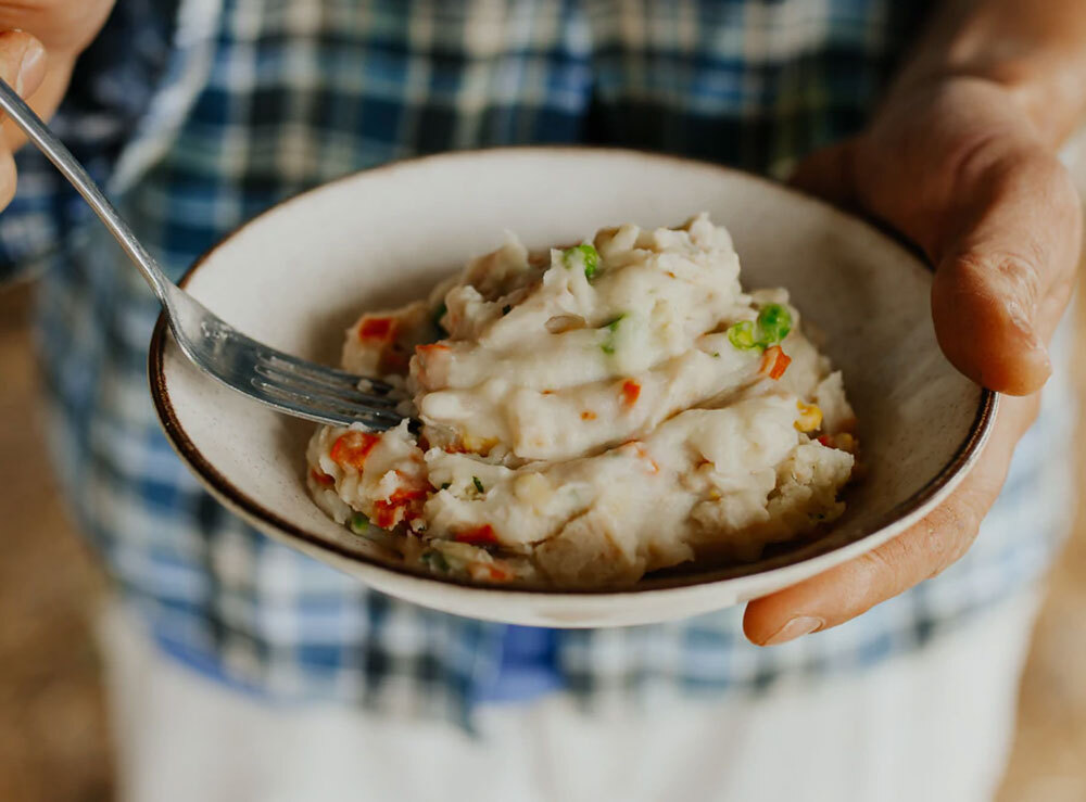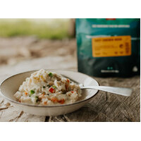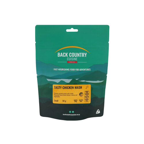 The Back Country Cuisine Tasty Chicken Mash is a creamy mashed potato with smoky flavoured freeze dried chicken, cheese and vegetables. Gluten free.