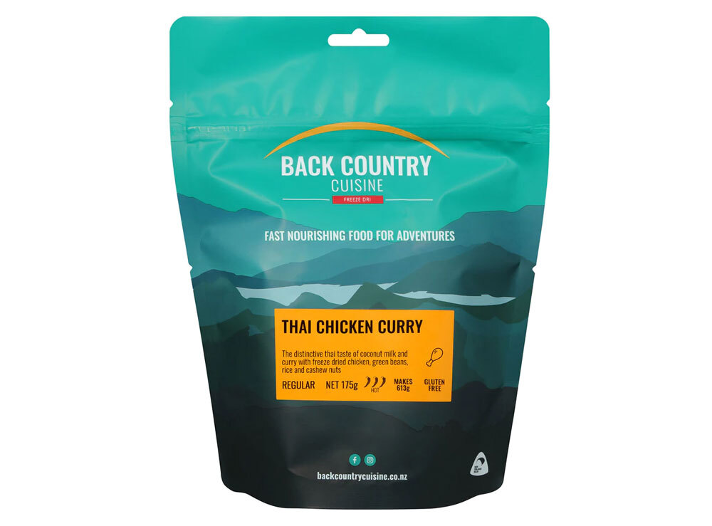 Back Country Cuisine Thai Chicken Curry has a distinctive Thai taste of coconut milk and curry with freeze dried chicken, green beans, rice and cashew nuts. Gluten Free. A quick and easy freeze dried meal, just add boiling water.
