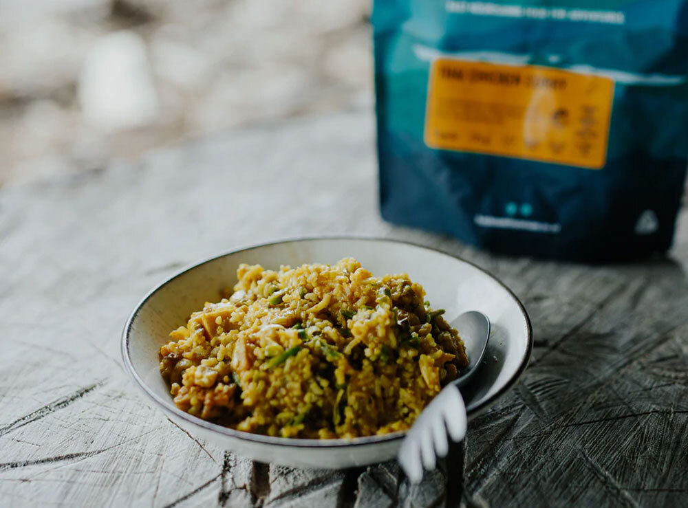 Back Country Cuisine Thai Chicken Curry has a distinctive Thai taste of coconut milk and curry with freeze dried chicken, green beans, rice and cashew nuts. Gluten Free. A quick and easy freeze dried meal, just add boiling water.