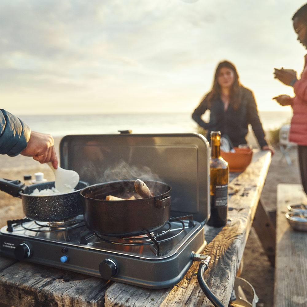 The CADAC 2 Cook 3 Pro Deluxe Cooker is a stylish, lightweight gas barbecue, the ultimate table top companion, with two independent burners.
