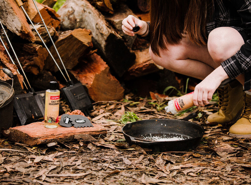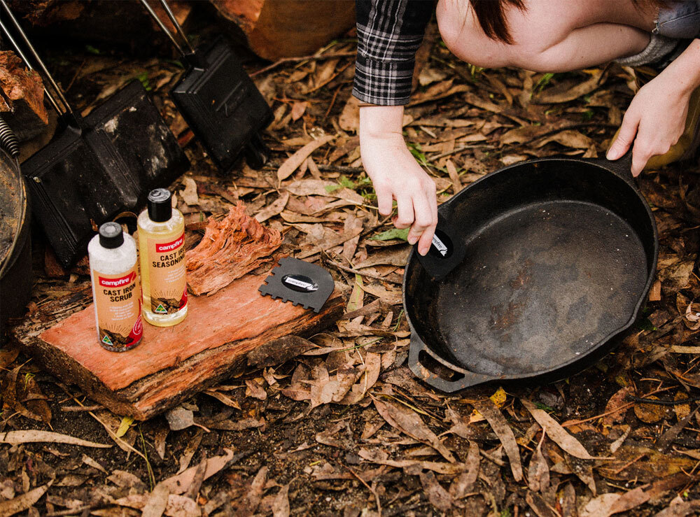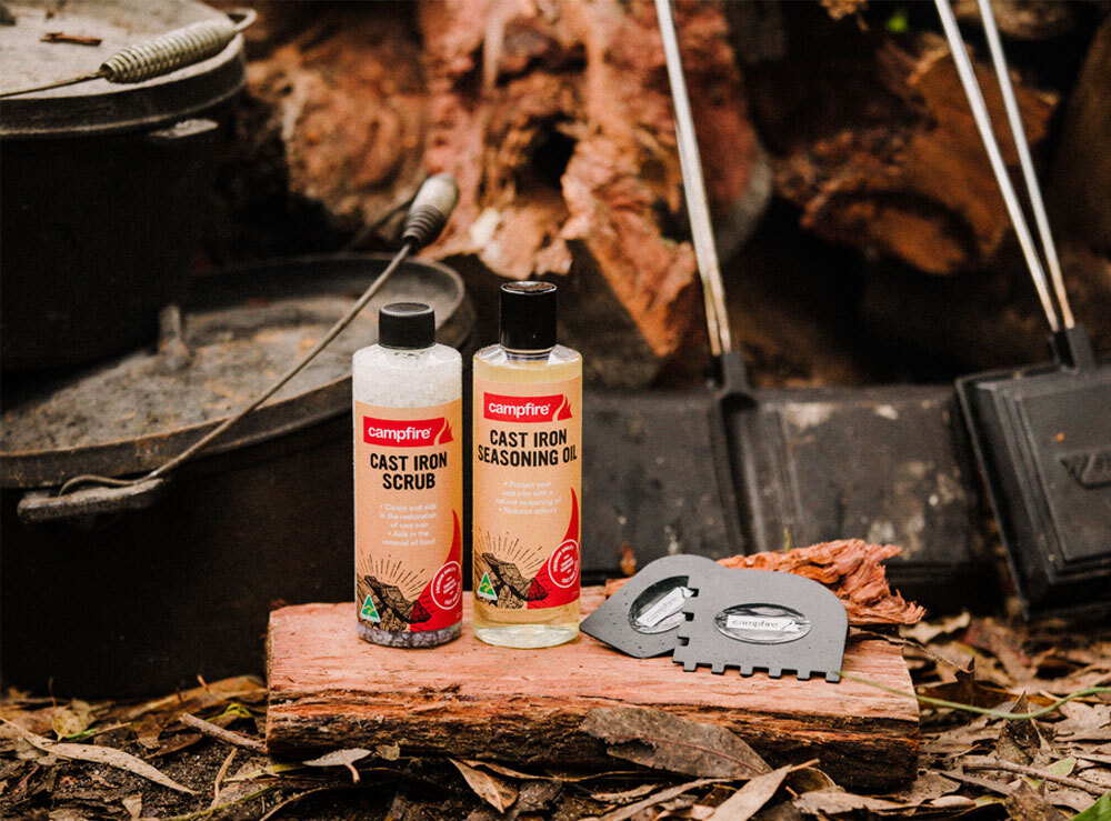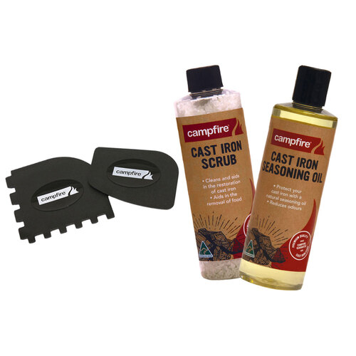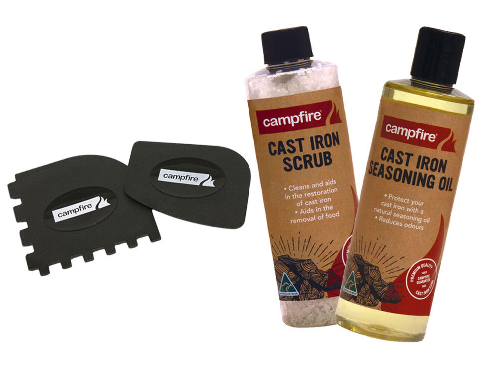 The Campfire Seasoning Oil protects your cast iron whilst also cleaning and reducing odours. The Campfire Scrub cleans and aids in the restoration of cast iron while also aiding in the removal of food. The Campfire Scraper Set removes baked on food from cast iron making clean up super easy.