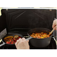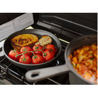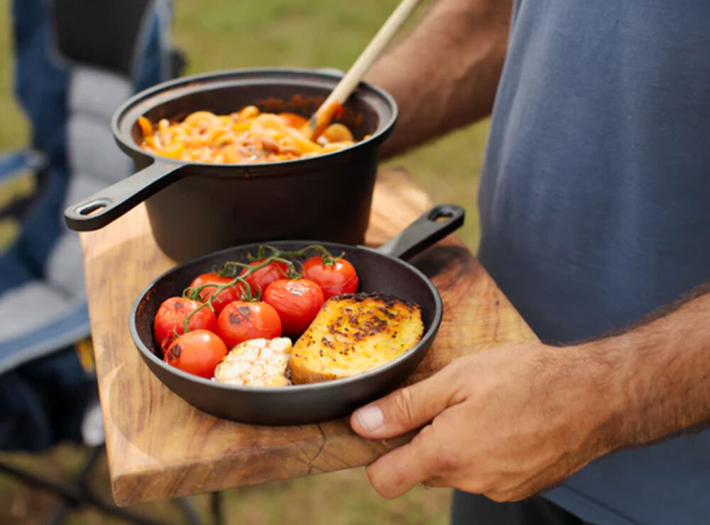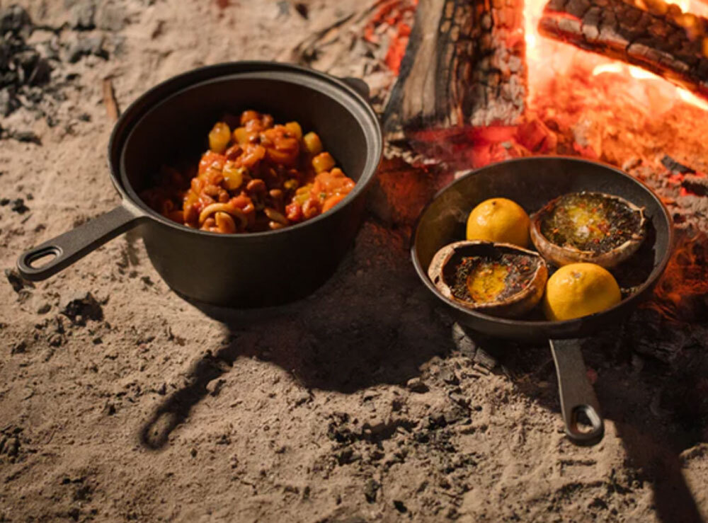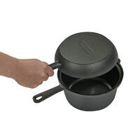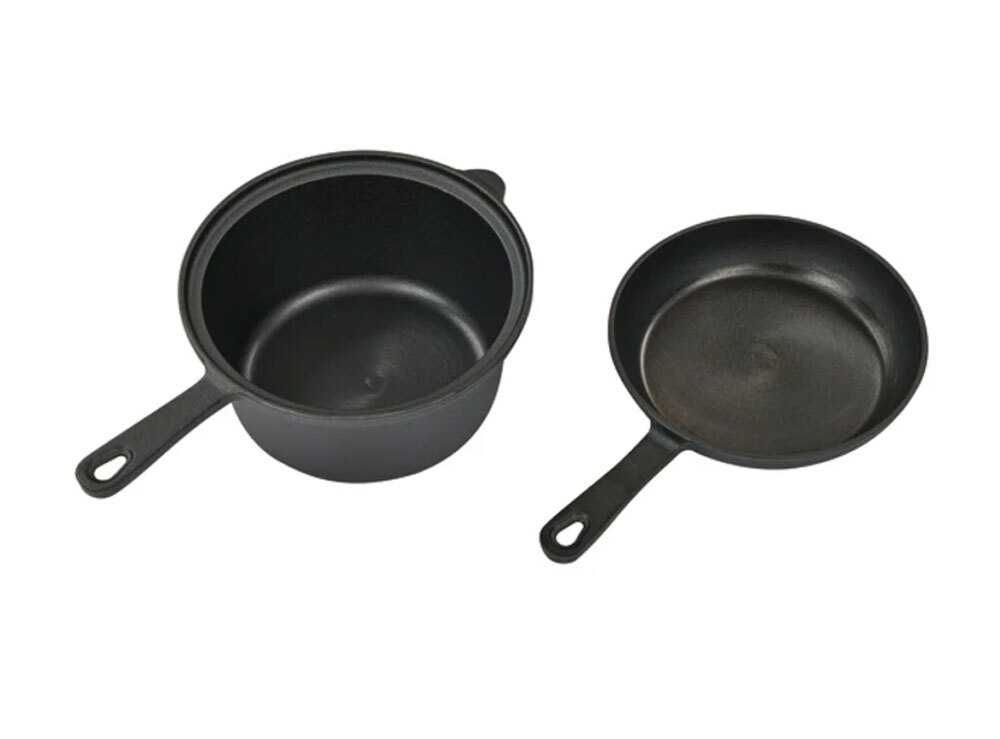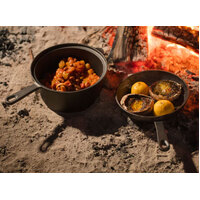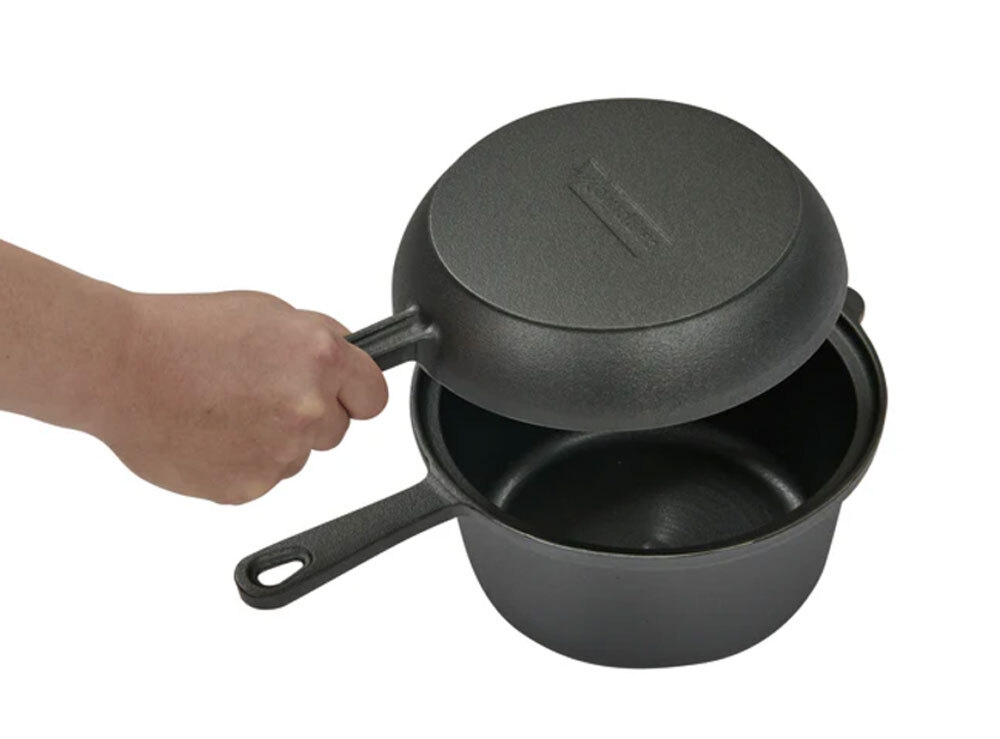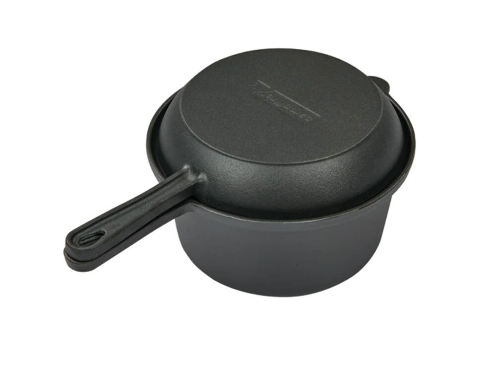 The Campfire Pre Seasoned Saucepan is a versatile 2.3QT cast iron saucepan with a skillet lid, perfect for simmering sauces or searing food. Pre-seasoned and ready for use over a campfire.