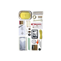 Contents: Compass, Fire Starter, 9.8’ Multi-Use Cord, 3’ Wire, 4 Waterproof Matches, 101’ Fish Line, Match Book, Razor Blade, 3 Twist Ties, 12” Duct Tape, Signal Mirror, Zip-Lock Bag, 2 Nails, 2 Safety Pins, 2 Fish Hooks, Signal Whistle, Sewing Needle, Note Paper, Pencil, Multi-Function Card Tool, 3' Rope, Tub Candle, Survival/First Aid Pamphlet.