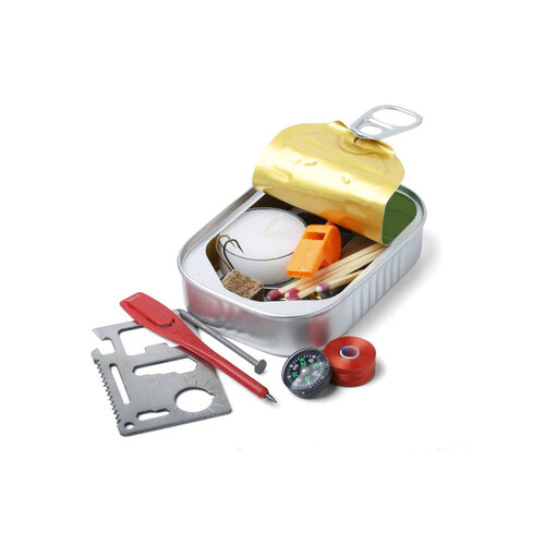 The Coghlans Survival Kit-In-A-Can contains 33 essential survival items. Made in Canada.
