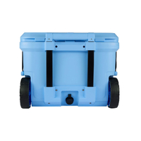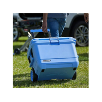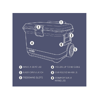 Rugged wheels and an extendable handle make it easy to roll across any terrain, while the one-handed stainless steel latch, tie-down points and non-slip feet keep things sorted on the move. Its got a lockable lid for added security, an attached extra-wide drain plug for fast clean-up, and an antimicrobial liner to help keep it odor and mould-free.