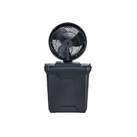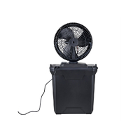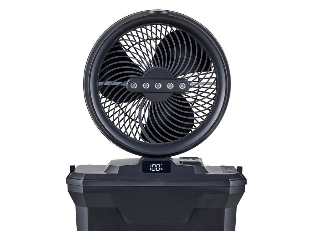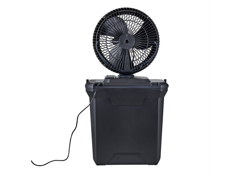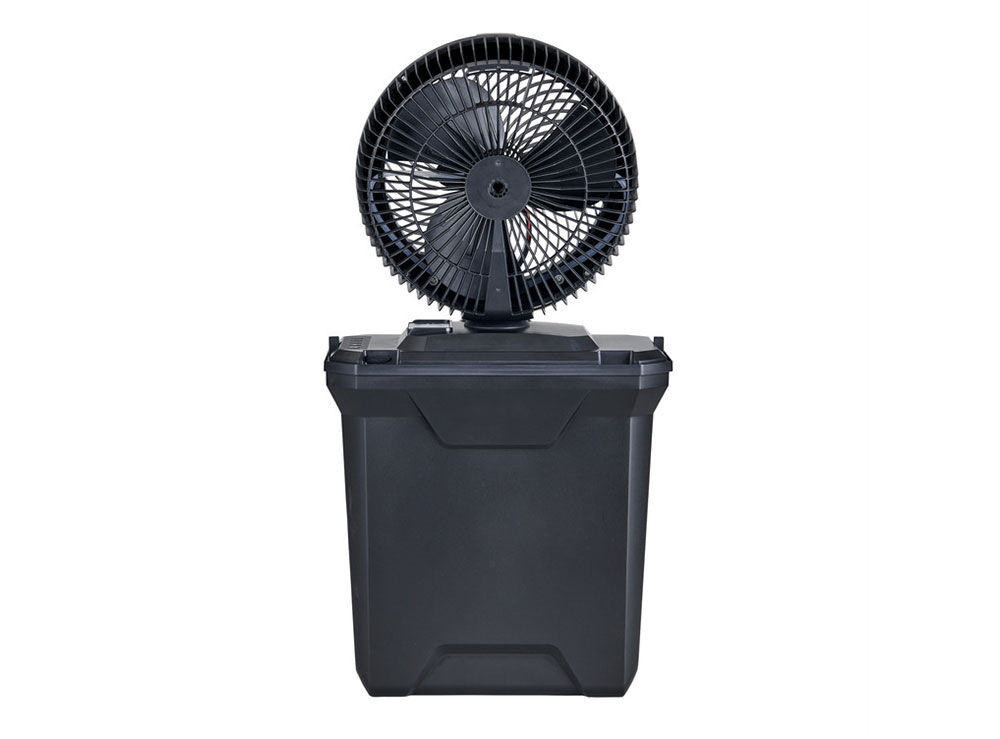 - The fan flips and stores easily inside the water tank for storage and features a built-in handle for easy transport.