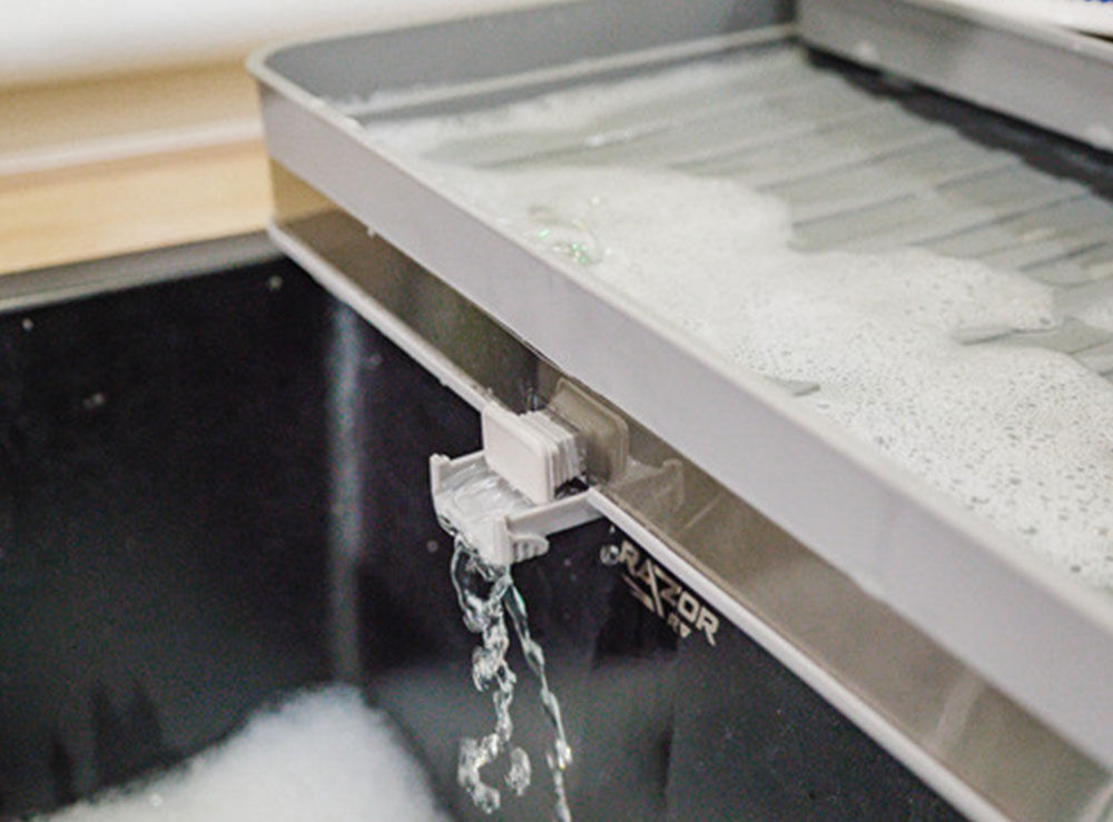 It includes a cutlery holder and dish holders, with water runoff directed into the base.