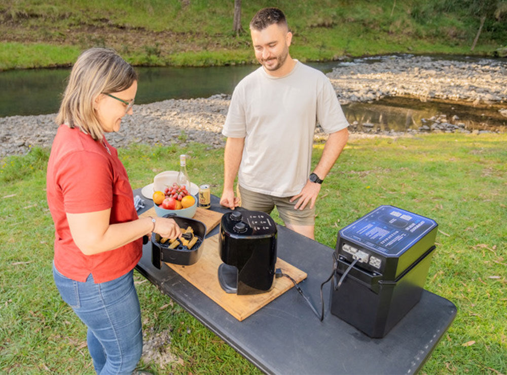 Cooking guidelines printed directly on the unit make it easy to reference as you go. For off-grid use, simply connect to a battery box or power station via the Anderson-style connector and enjoy hot, tasty snacks anytime.