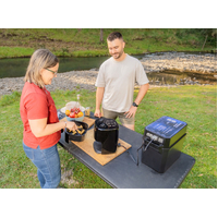 - Connect to a battery box or power station via the Anderson-style connector for hot snacks on the go.