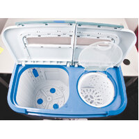Featuring a wash and spin capacity of 2kg with an agitating wash action, the Ezywash Portable Twin Tub Washing Machine is compact and modern. The machine is manufactured from strong and durable ABS plastic and features smooth curved surfaces with strong integrated handles to make moving easy.
