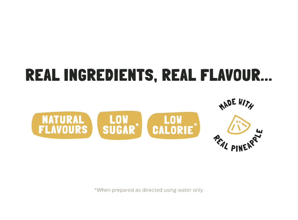 Natural Sweeteners [Erythritol, Steviol Glycosides (Stevia)], Natural Flavours, Fruit Powders [Freeze-Dried Pineapple (6.2%), Coconut Water (6.2%)], Acid (Citric Acid), Mineral Salts (Calcium Phosphate, Calcium Carbonate).