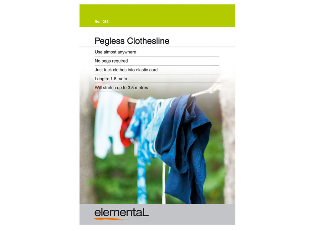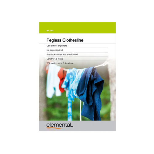 The Elemental Pegless Clothes line is a 1.8m long, handy clothes line that is easily attached between two objects.