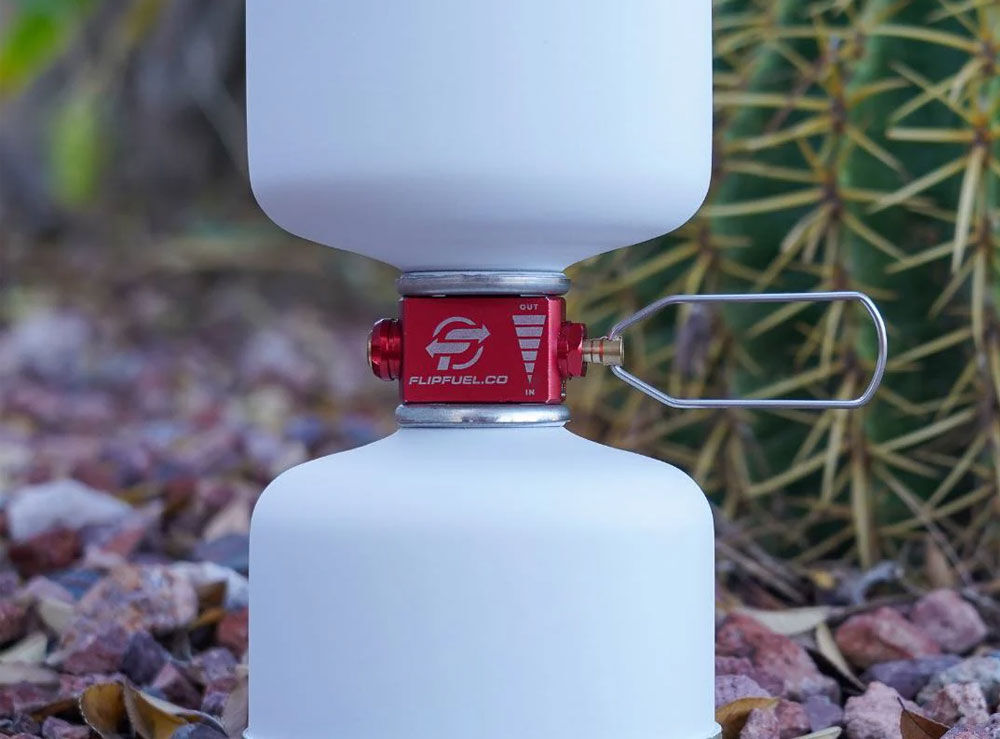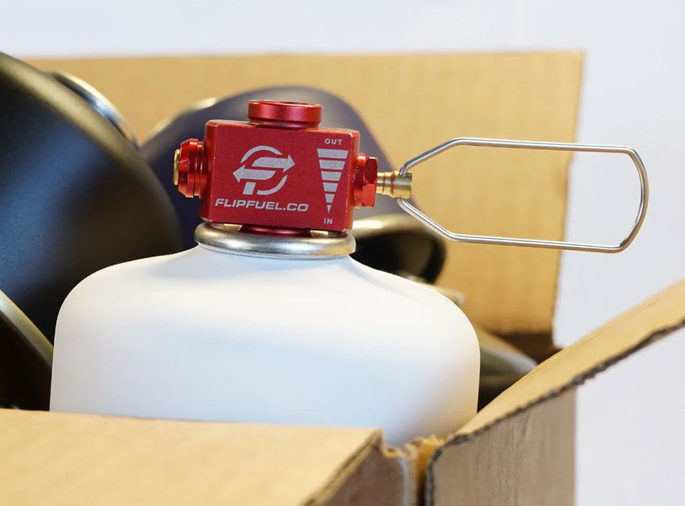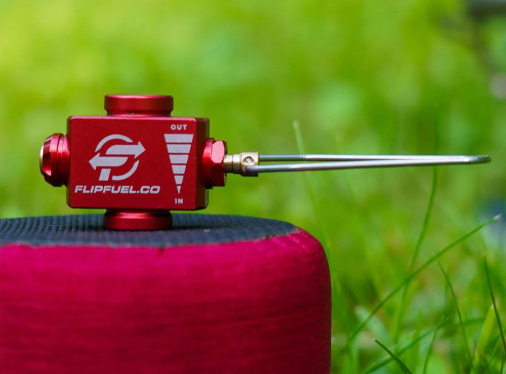 Now you can easily consolidate your backpacking fuel & recycle the empty fuel canisters with the FlipFuel® Fuel Transfer Device.