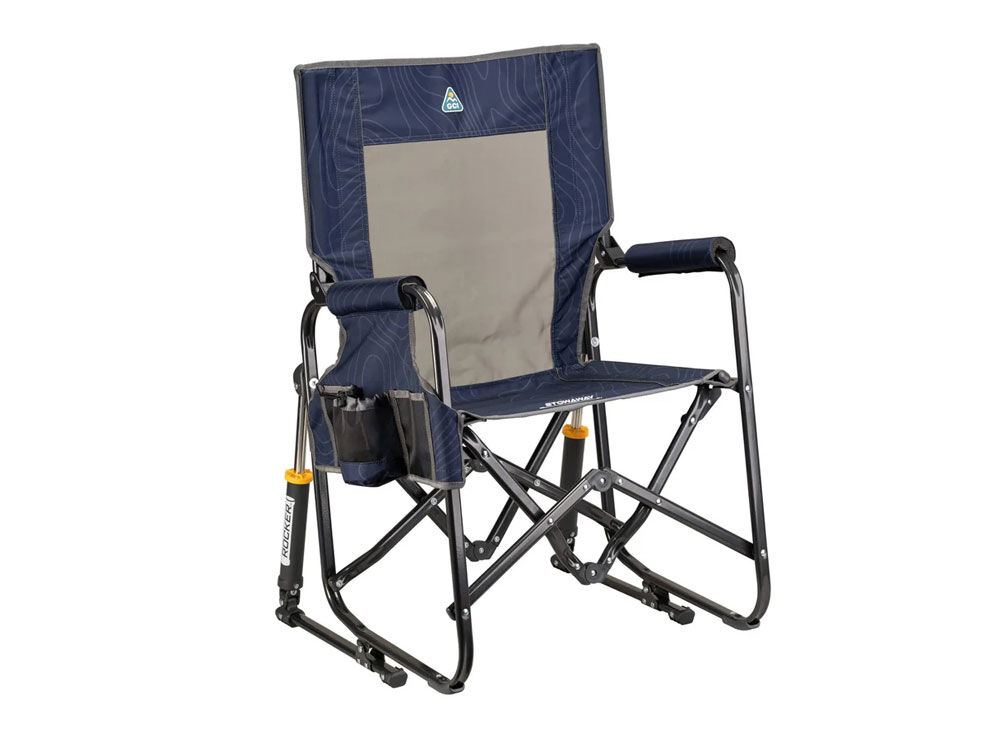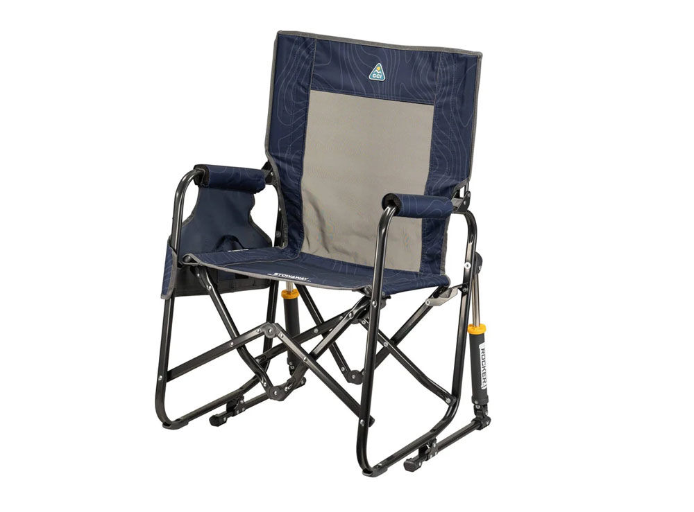 The GCI Outdoor Stowaway Rocker™ in Navy Topo is the revolutionary folding chair designed to offer the superior comfort of a high-back rocker with a breakthrough compact storage size.