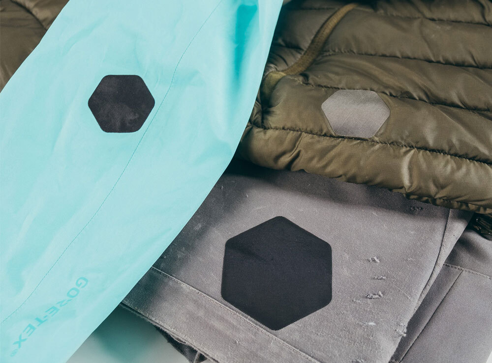 The small hex is perfect for baffles on down sweaters, sleeping bags, and backpacks while the large hex fixes bigger repairs on tents, sleeping pads, and waders.