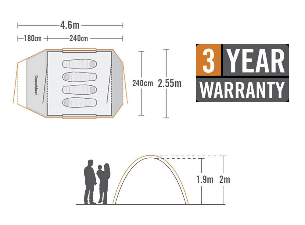 The colour-coded frame streamlines setup, making assembly a breeze. The impressive 5000mm aqua rating, paired with 75 denier fabric and UV protection, will provide shelter and defense against the elements. Sturdy fiberglass poles, quality zips, ropes, and poles enhance durability for a long-lasting camping experience.