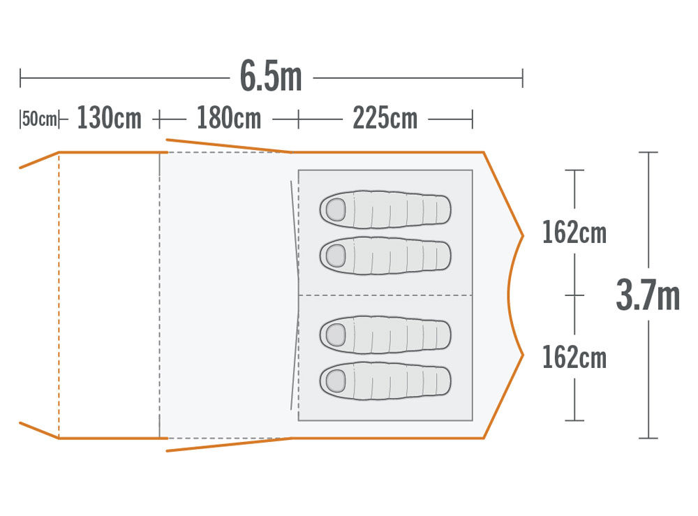 - A darkened, breathable polyester inner pod system seamlessly connects to the tent body and floor, reducing trip hazards, while also offering flexible configurations with a removable divider for one or two bedrooms.