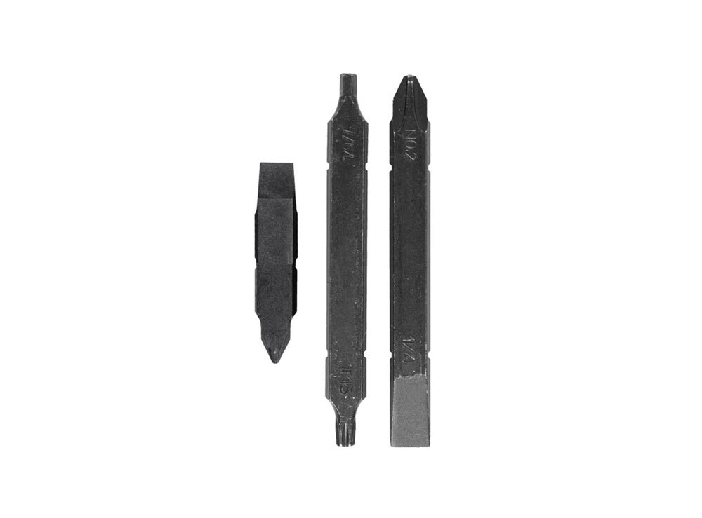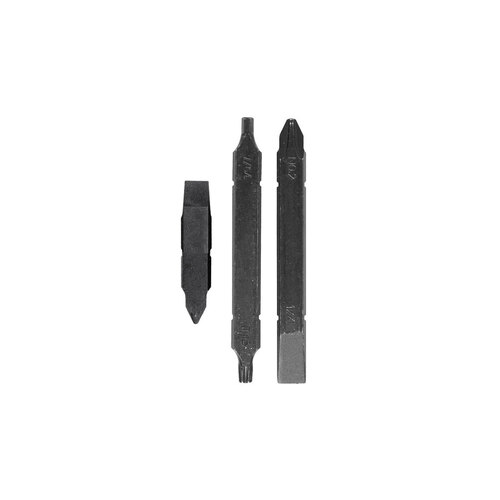 Includes: Three loose double-ended bits: Long Phillips #2 and 1/4" Screwdriver Long Torx #15 and Hex 7/64" Short Phillips #1-2 and 3/16" Screwdriver.