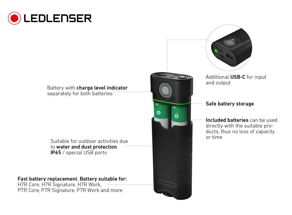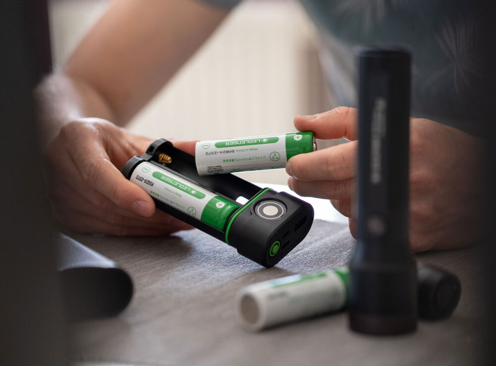The Flex10 can be operated with two batteries type 21700 (included). Thus, the LEDLenser Flex10 Powerbank reaches a capacity of 9000 mAh.
