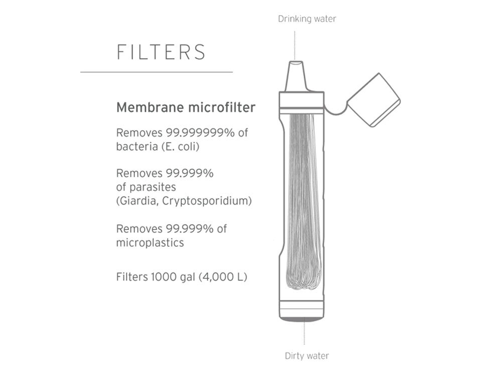 - Long-lasting membrane microfilter will last up to 4,000 L (1,000 gallons) of water, that’s enough drinking water for one for over 5 years