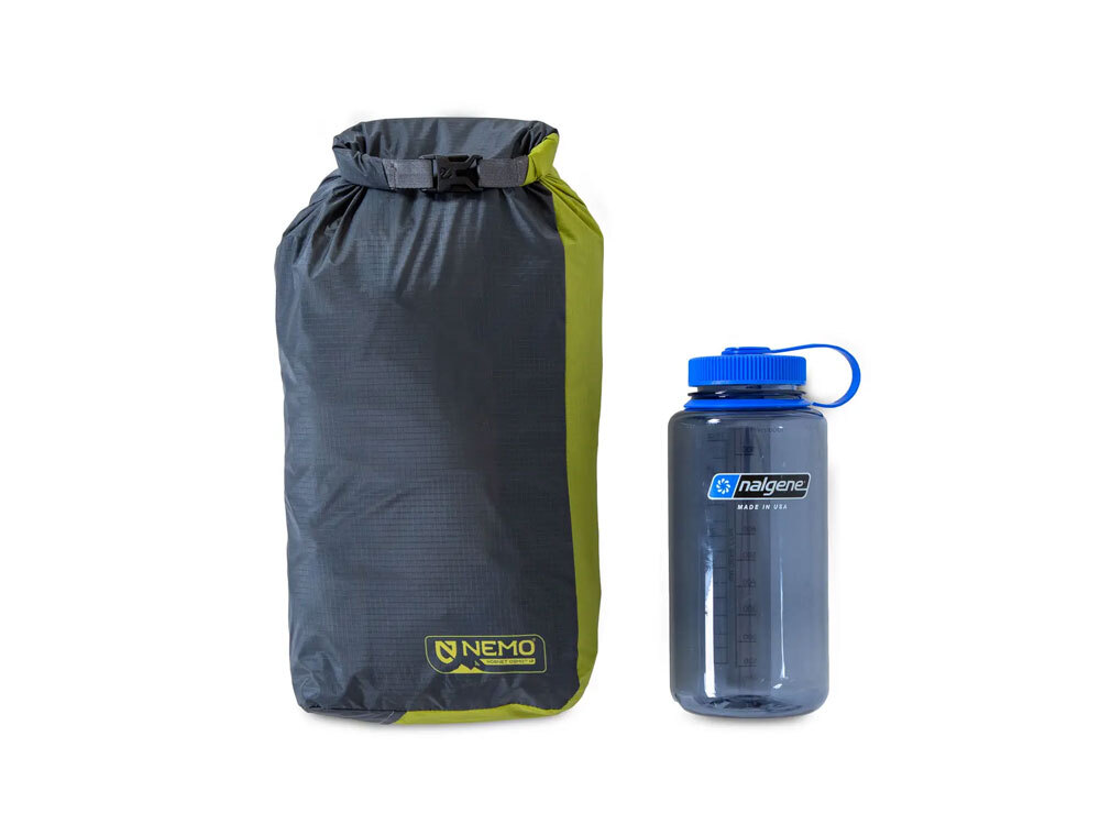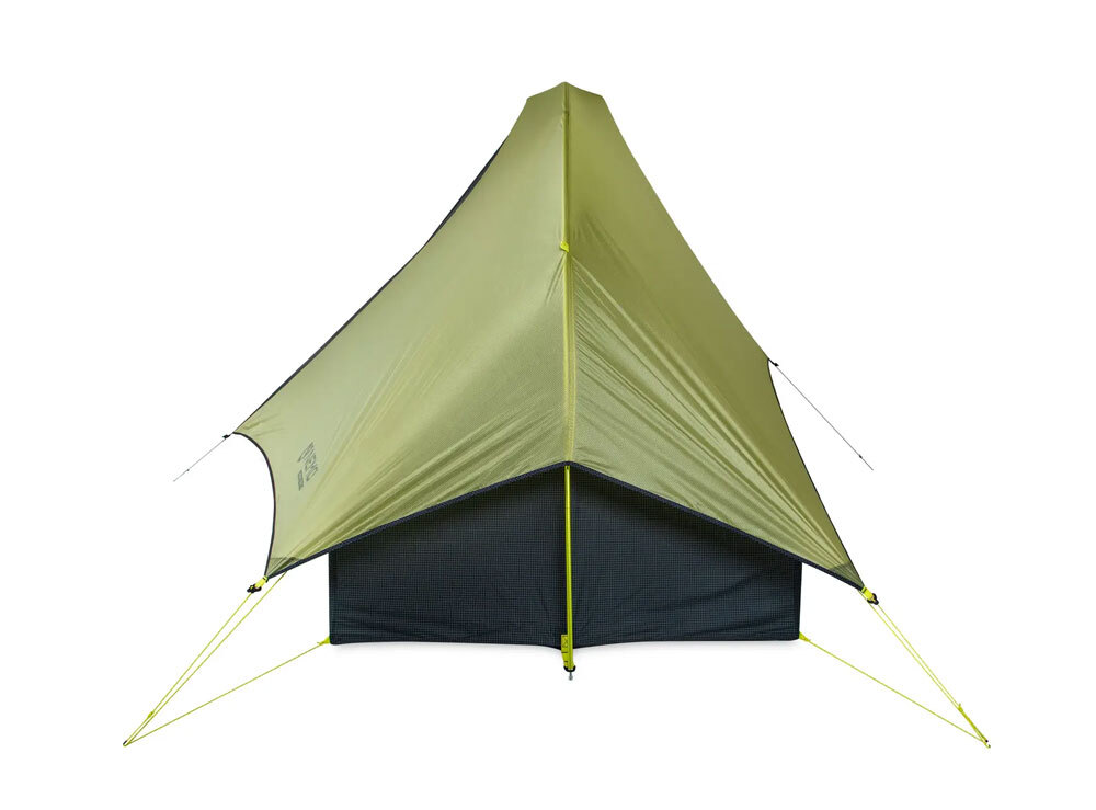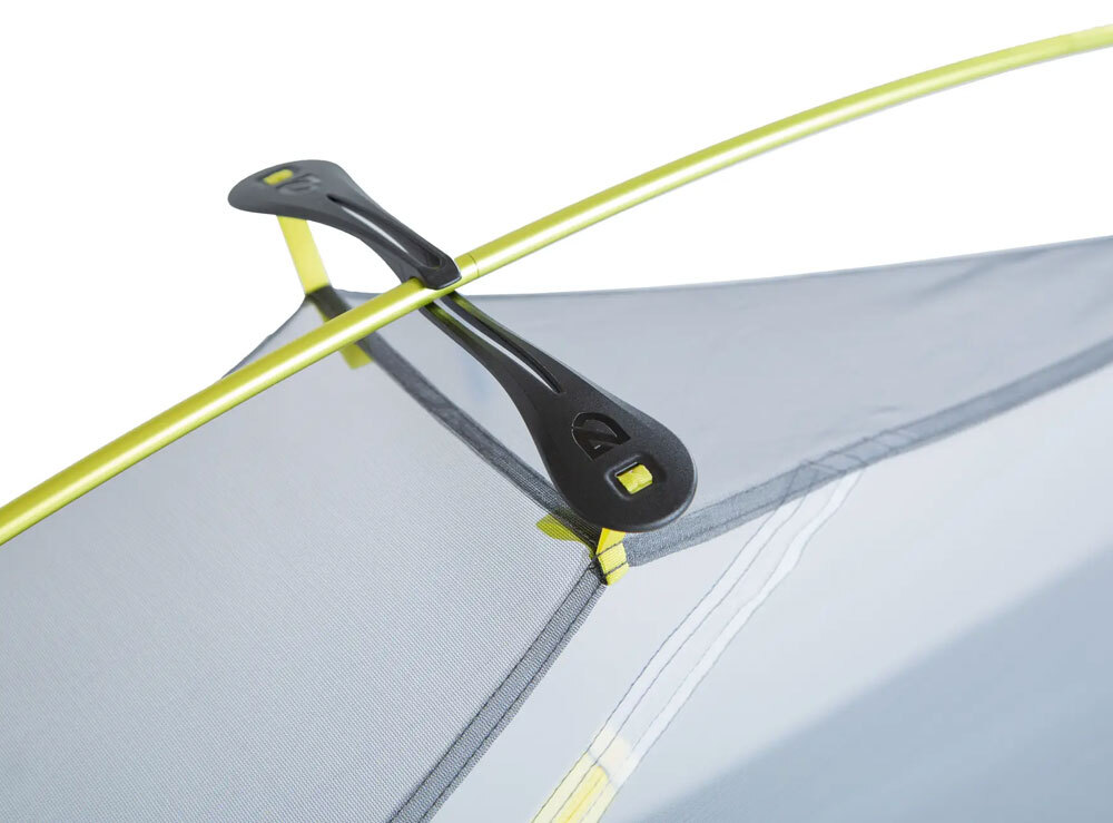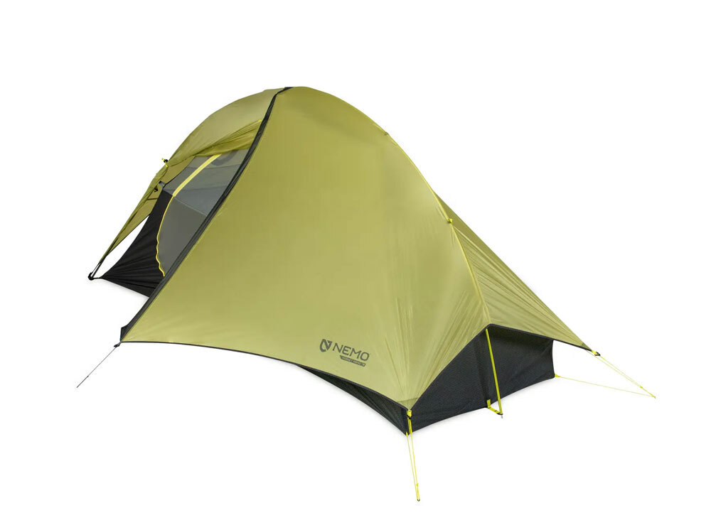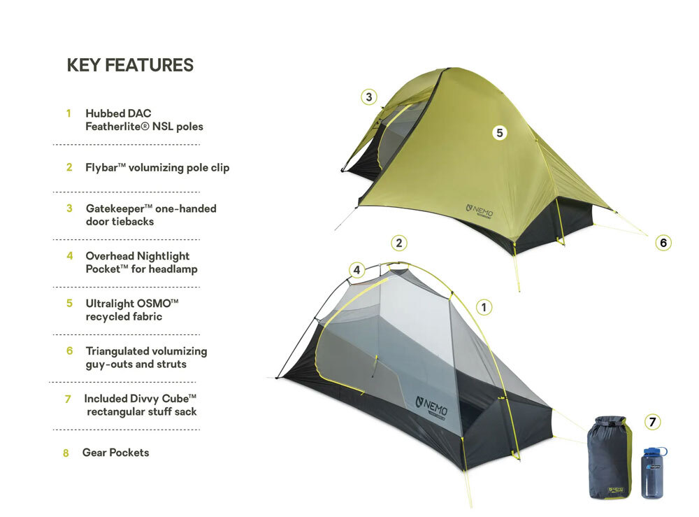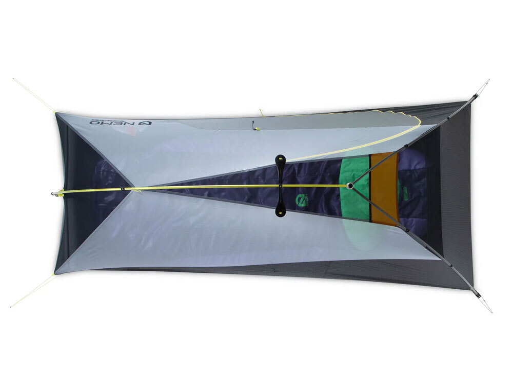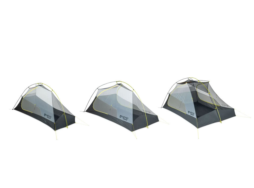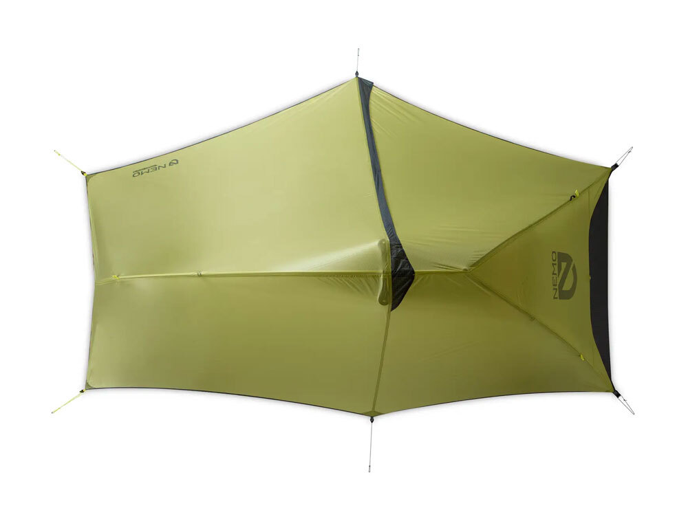 Keeping Hornet OSMO extra trim is a minimal pole structure that sets up lightning-quick and pairs with Nemo's volumizing Flybar™ and door clips to create generous internal space. Triangulated reflective guy-outs and corner struts also increase volume at the foot and protect sleeping bags from tent wall condensation. An overhead Nightlight Pocket™, Gatekeeper™ one-handed tiebacks, and rectangular Divvy Cube™ stuff sack are new additions that add ease and creature comforts, not ounces. With the new Divvy Cube, this tent packs down small enough to fit in the bottom compartment of your pack — with a sleeping bag!