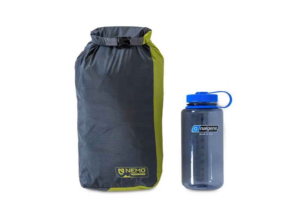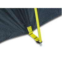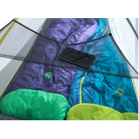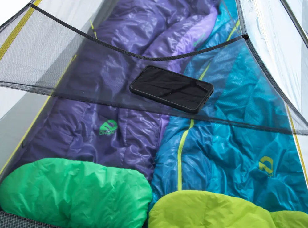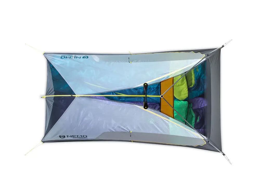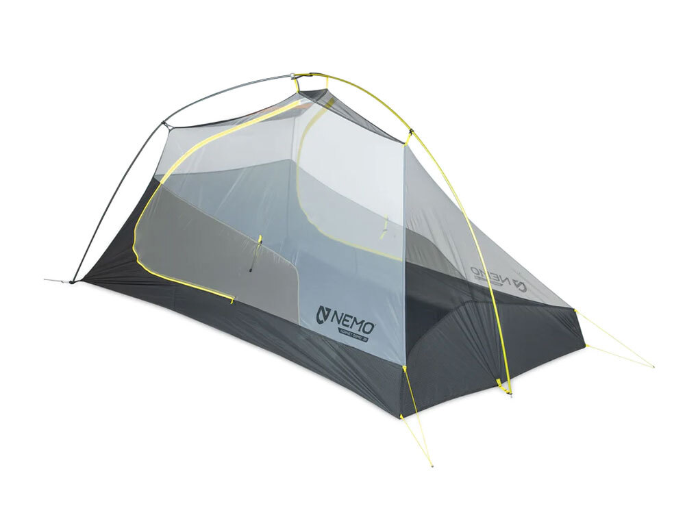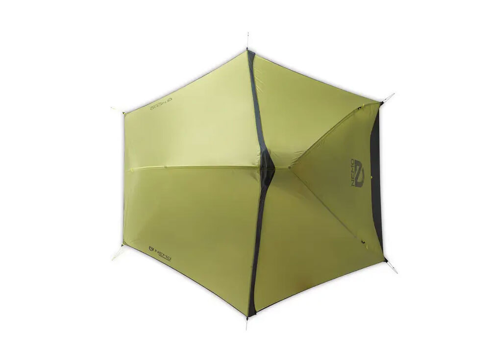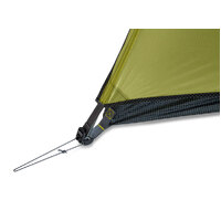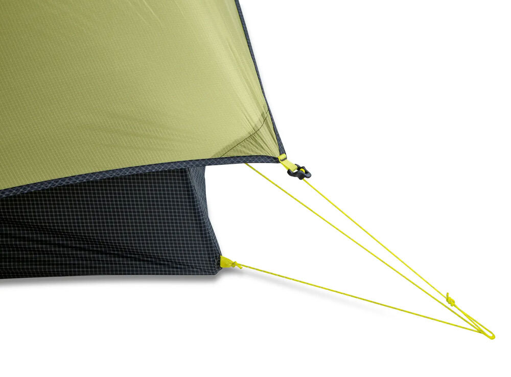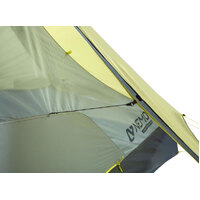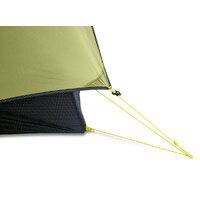 Keeping Hornet OSMO extra trim is a minimal pole structure that sets up lightning-quick and pairs with Nemo's volumizing Flybar™ and door clips to create generous internal space. Triangulated reflective guy-outs and corner struts also increase volume at the foot and protect sleeping bags from tent wall condensation. An overhead Nightlight Pocket™, Gatekeeper™ one-handed tiebacks, and rectangular Divvy Cube™ stuff sack are new additions that add ease and creature comforts, not ounces. With the new Divvy Cube, this tent packs down small enough to fit in the bottom compartment of your pack — with a sleeping bag!