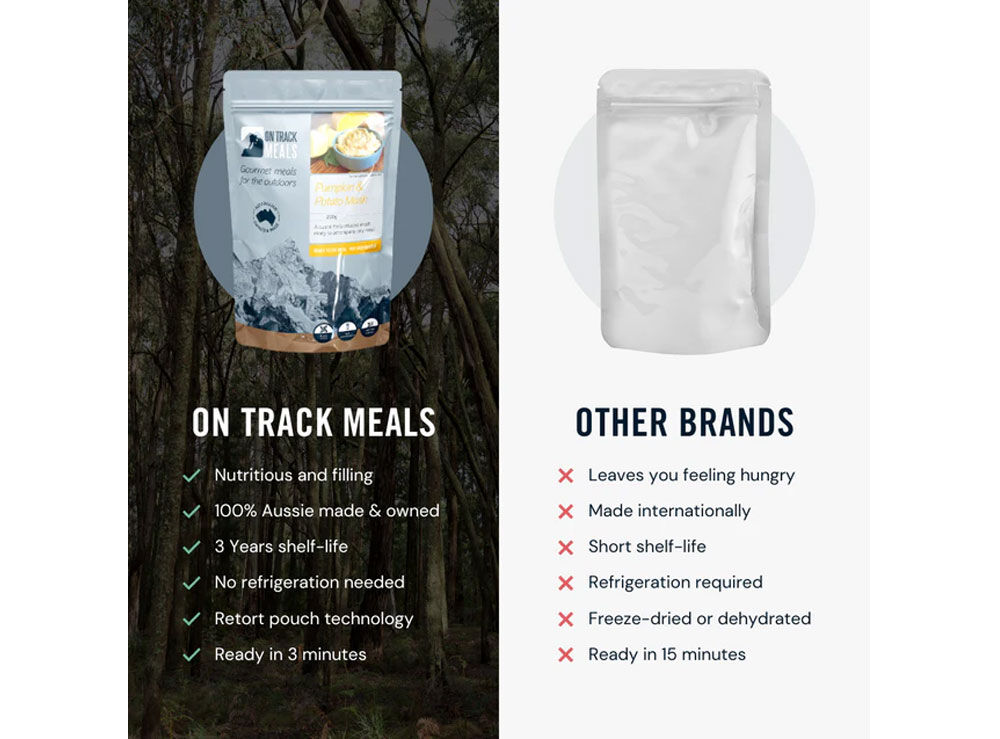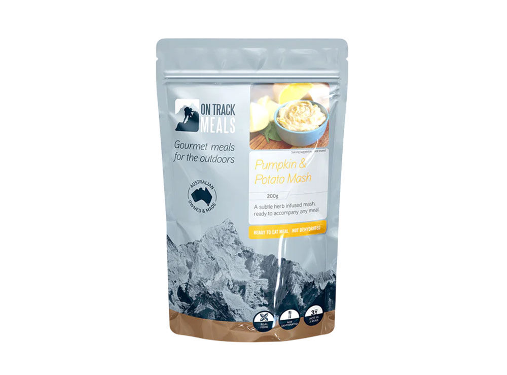 The On Track Pumpkin & Potato Mash Ready-to-Eat Meal is a smooth pumpkin and potato mash infused with subtle herbs, making it an easy and versatile side dish for all kinds of camping meals. Comforting, tasty and easy to pair, it is a handy option for tramping, hunting, travel, or emergency food supplies.