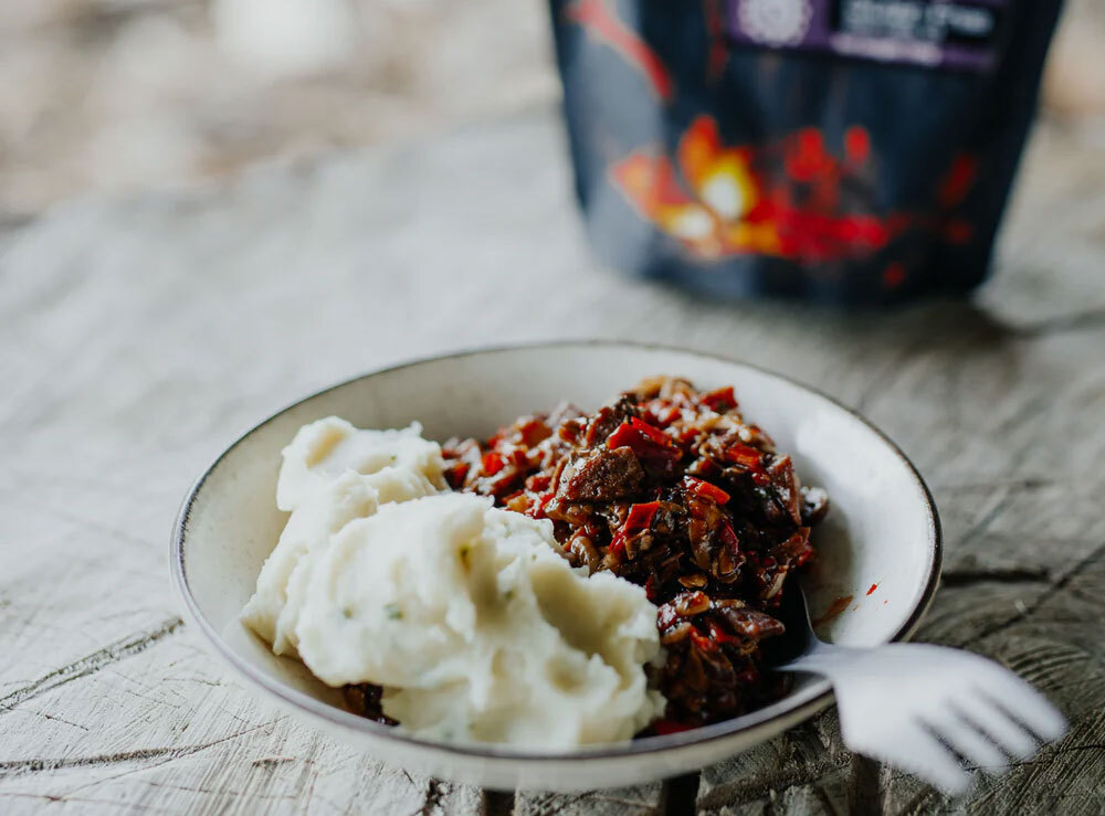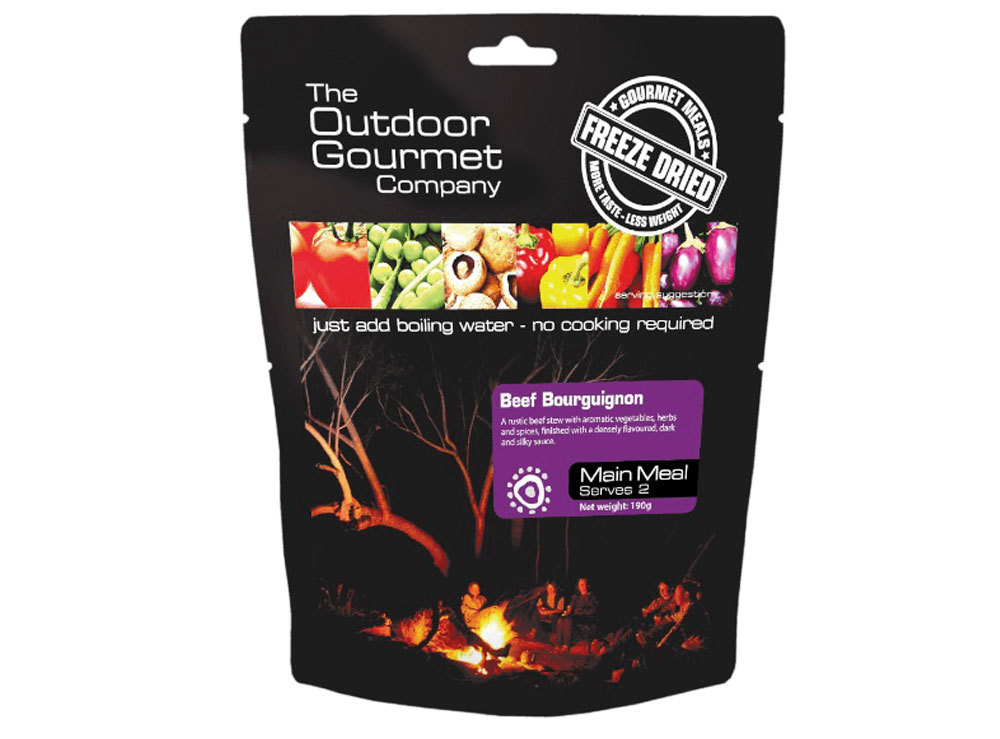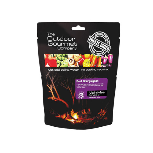 The Outdoor Gourmet Company Beef Bourguignon is a rustic beef stew with aromatic vegetables, herbs and spices, finished with a densely flavoured dark and silky sauce.