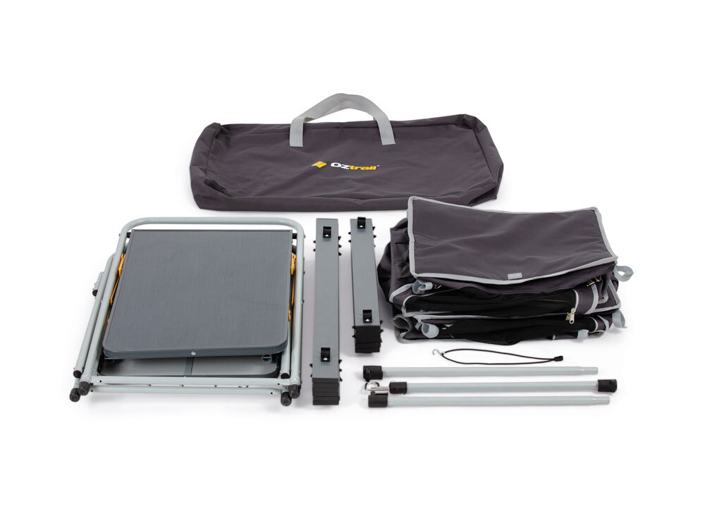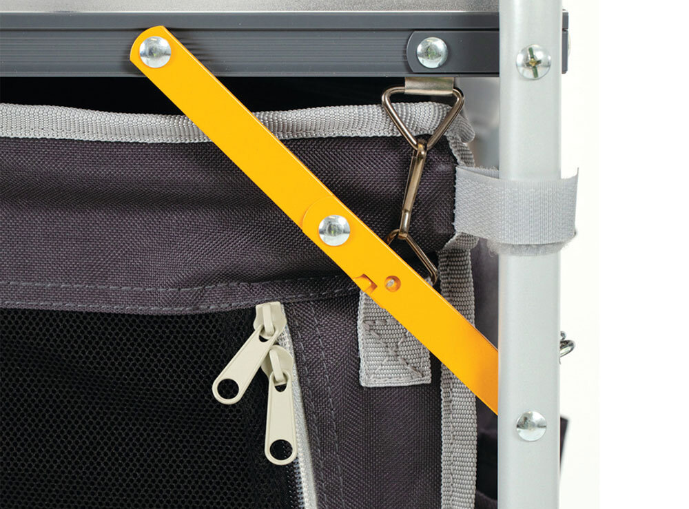 Be the most organised camper on site and store your food and tableware in the cupboards. Also featuring a towel holder, handy side mesh pockets and a carry bag, this kitchen has all you need for the perfect trip away.