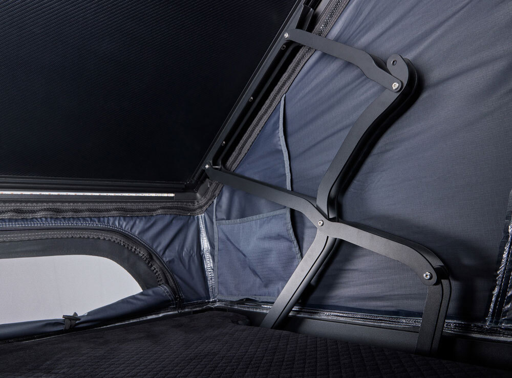 The robust roof bars provide easy access storage for recovery gear, solar panels and other rooftop cargo. Thoughtful design and the unique robust four-point scissor frame give you an extra window, providing more light, height and ventilation.