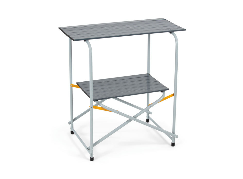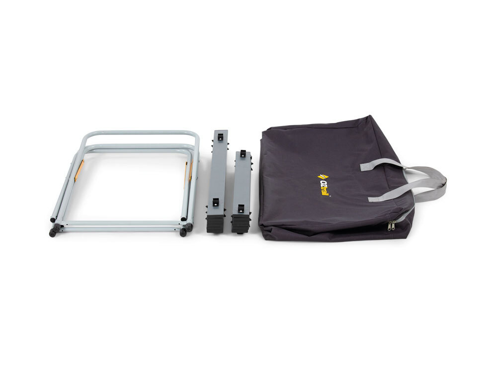 The kitchen sets up fast, packs down fast and is super sturdy. Everything you need for a quick kitchen set up. The benchtop is an aluminium slat top suitable for large format stoves and the kitchen has a storage shelf below to put your cooking supplies. Carry the kitchen in the carry bag to and from your destiation to prevent damage during transport.