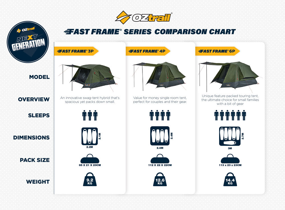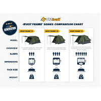 The Fast Frame 4P tent by OZtrail is an ideal single-room tent for couples and their gear. With OZtrails Fast Frame® system, this tent sets up in minutes without hassle.