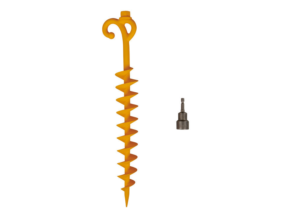 Kit Includes: 4 x 40cm Screw-in Sand Pegs, 1 x 19mm Drill Adaptor, 1 x Heavy-Duty Carry Case