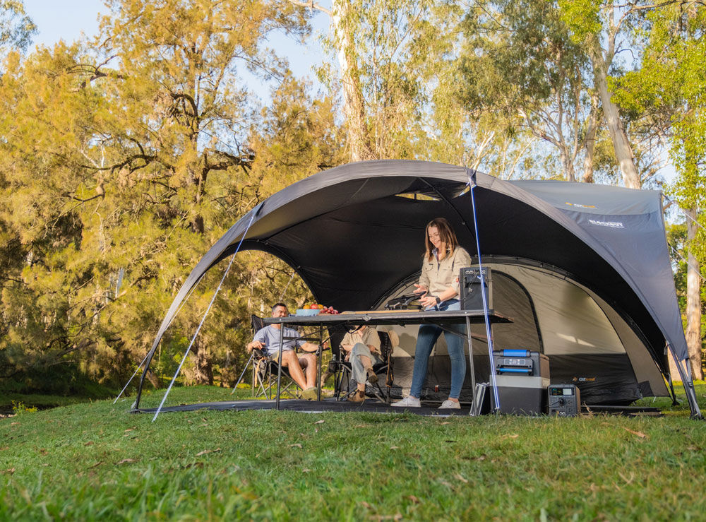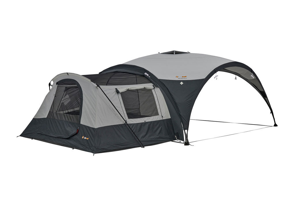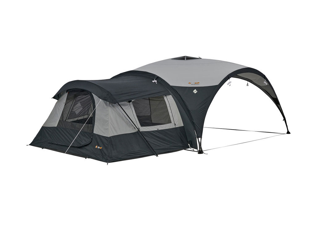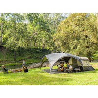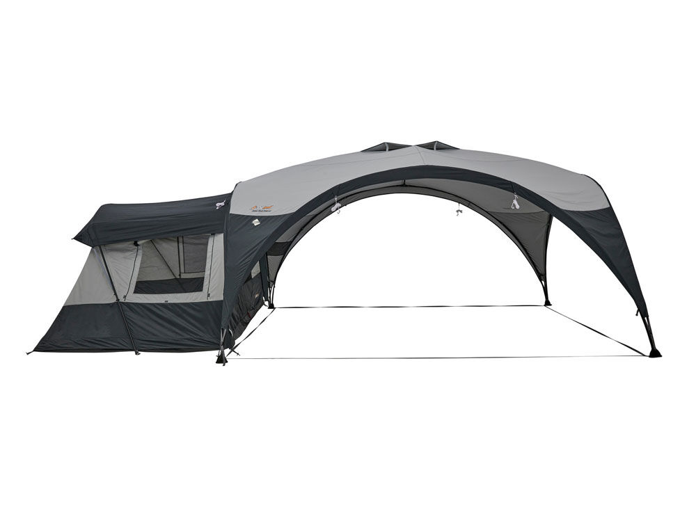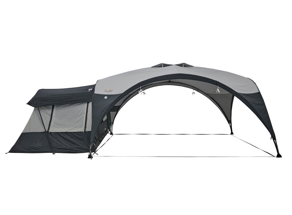 Transform your campsite with the OZtrail Shade Dome Deluxe Portico Tent – a versatile addition to your OZtrail 4.2m Shade Dome setup (sold separately).