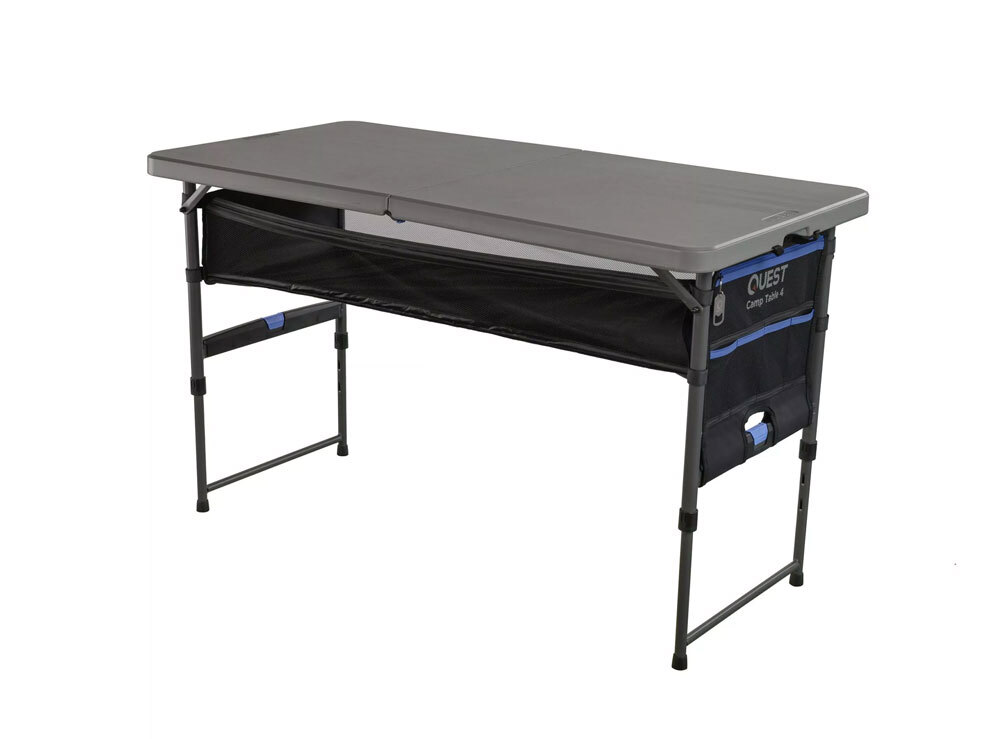 Sturdy, lightweight and super practical - the Quest Camp Table 4 with Storage is the ultimate addition to your gear set up. Featuring super-easy single-handed height adjustment mechanism, it goes from low coffee table height right through to preparation table height of 86cm.