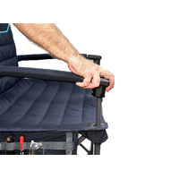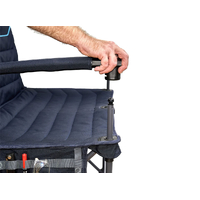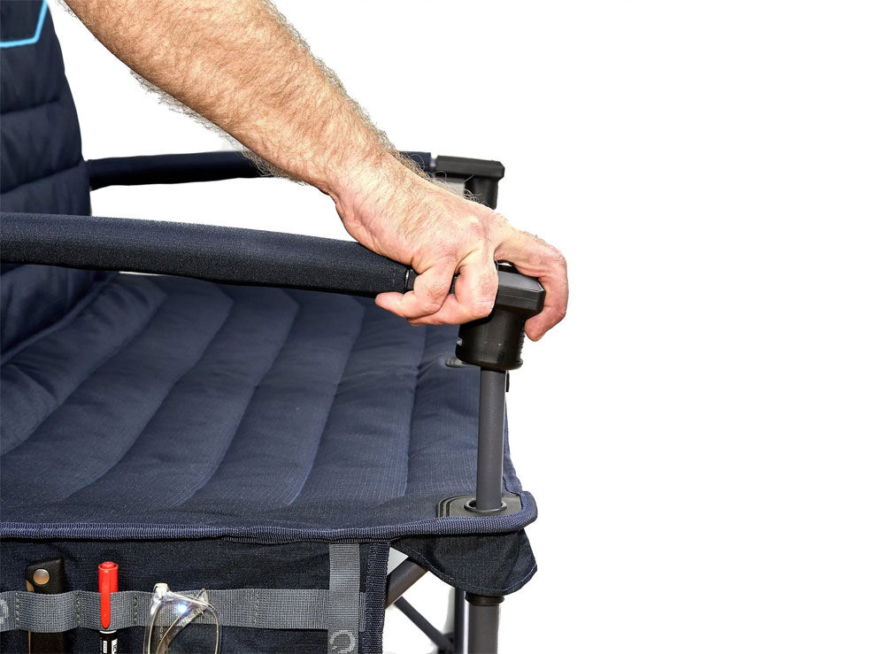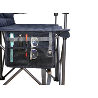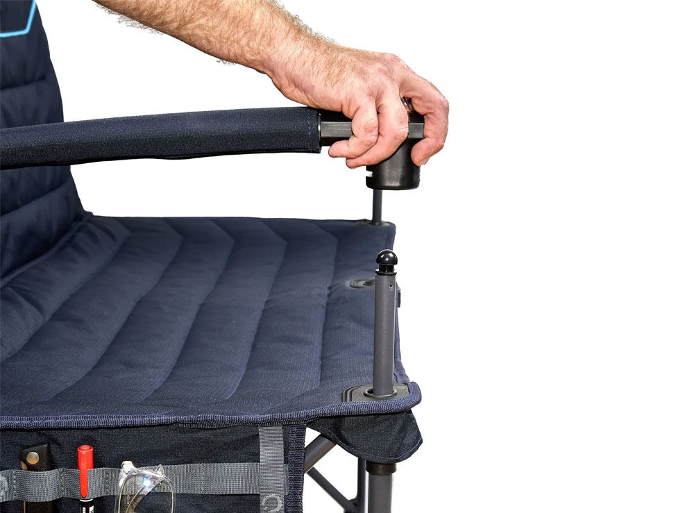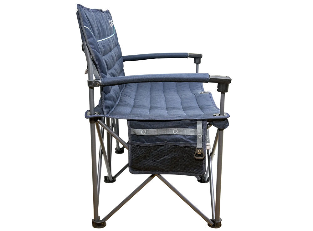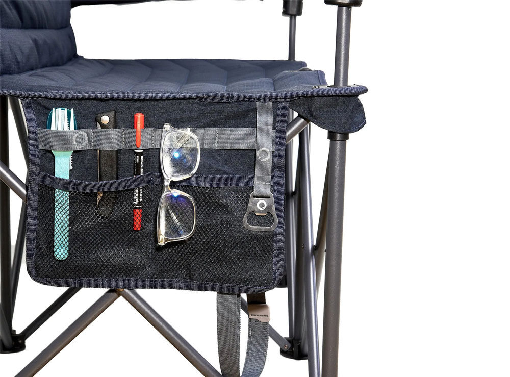 The hard arms make getting in and out a breeze. Once you’re comfy, you won’t have to get back up, as there’s a mesh pocket on the rear for keeping your phone, tablet, or book nice and close, plus side organiser pockets.