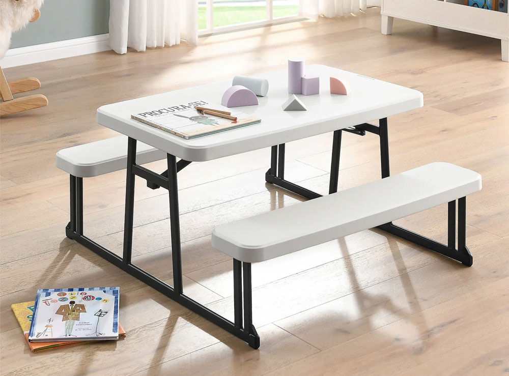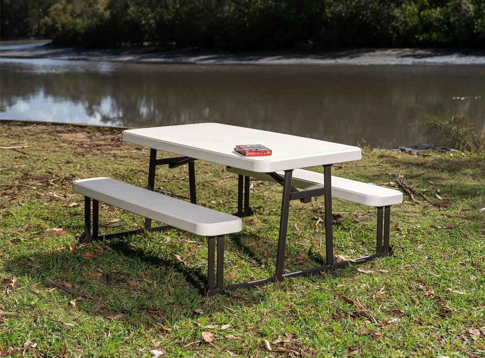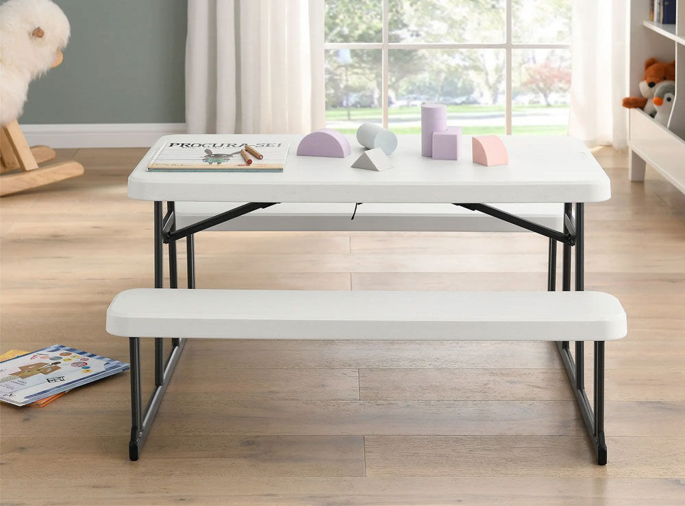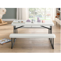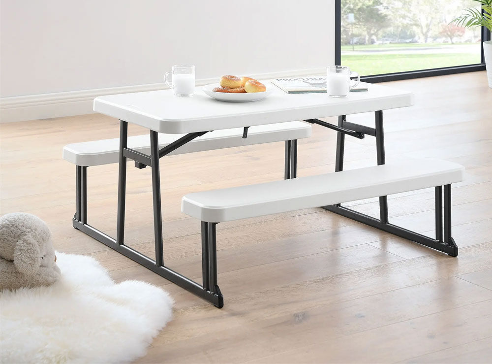 From simple backyard fun, outdoor trips and even indoor play time, the Quest Kids Folding Picnic Table & Bench Set provides a comfortable spot to park the youngsters.
