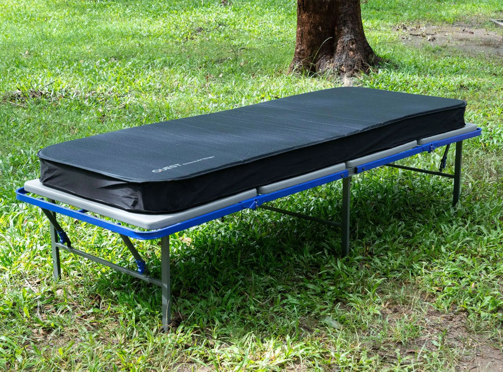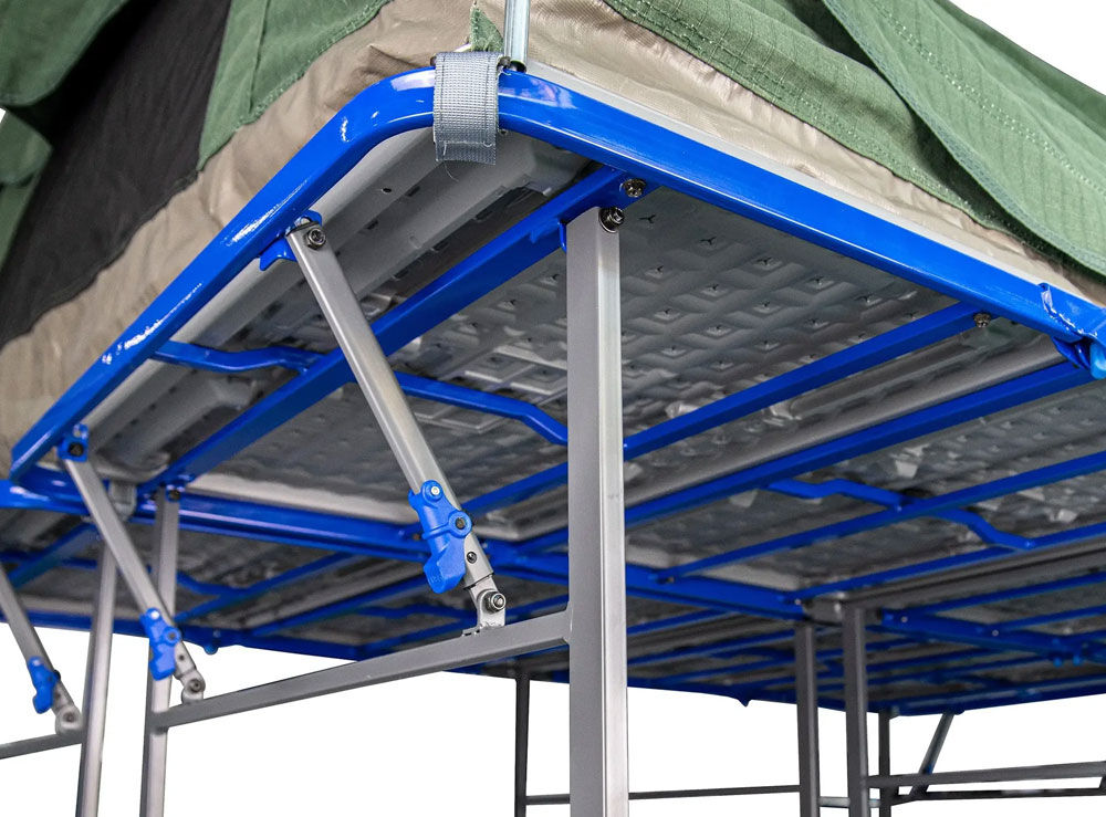 The frame is constructed from powder-coated steel and blow-moulded panels, which effectively distribute weight and provide a stable, level, and solid sleeping base. It is static weight-tested to support over 300 kg and is fully weather-resistant, designed to prevent water accumulation—water simply runs through it.