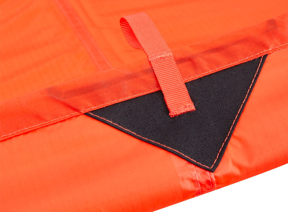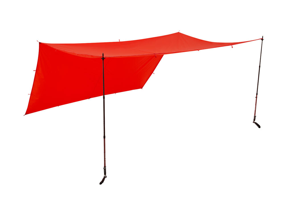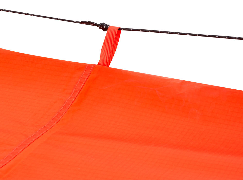 The 3m x 3.66m, large rectangular tarp is made from tough, siliconised 30D Cordura with a PU coating. Ultralight and waterproof, it’s incredibly strong and resilient. The 20 guy points are reinforced for strength and offer a variety of different setup options with one central lifter point.